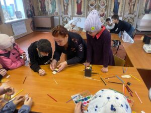 В продолжение встречи инспектор рассказала воспитанникам воскресной школы о том, что матрешка в России символизирует материнство, семью, плодовитость, продолжение рода и жизни и родственные связи. Название «матрешка» — уменьшительно-ласкательная форма имени Матрена, которое и было популярно в России в конце 19 века. Далее настал самый интересный момент: взрослые вместе с детьми расписали для поздравления мам деревянных матрешек, а затем изготовили из них сувенирные магнитики. Во время творческого процесса транспортные полицейские провели игру – викторину «Сердце матери лучше солнца греет». Дети отвечали на вопросы викторины, разгадывали загадки, продолжали пословицы, говорили комплименты и описывали своих мам прилагательными, пели песни о маме и читали стихи.